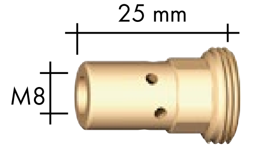 Acest produs este un suport pentru duză de contact / portduză de curent produs de ABICOR BINZEL, destinat pistolelor de sudură MIG/MAG. Acesta permite fixarea și conectarea duzei de contact într-un pistol MIG/MAG, asigurând un transfer stabil și eficient de curent între pistol și firul de sudură. Suportul este proiectat cu filet M8 pentru montajul duzelor și cu filet exterior M10x1 pentru conectarea la pistol. Lungimea totală este de circa 25 mm, ceea ce îl face potrivit pentru pistoalele MIG/MAG din seriile MB-401 și MB-501. Materialul folosit este cupru sau alama, conferind durabilitate și conductivitate bună pentru procesele de sudare uzuale.